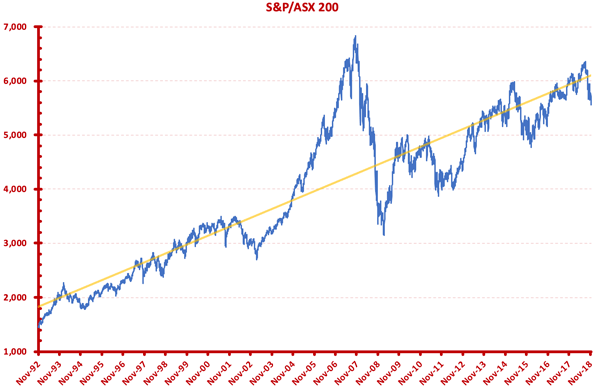 Market downturns, as we said, happen regularly. Some are worse than others. Chart 1, below, shows the movement of the Australian sharemarket’s Top 200 stocks since November 1992. You can see the market moving around the long-term trend (which is definitely upward-sloping), sometimes quite a lot. The Global Financial Crisis of 2008 is a prominent downturn but, in the ten years since the market has performed strongly.