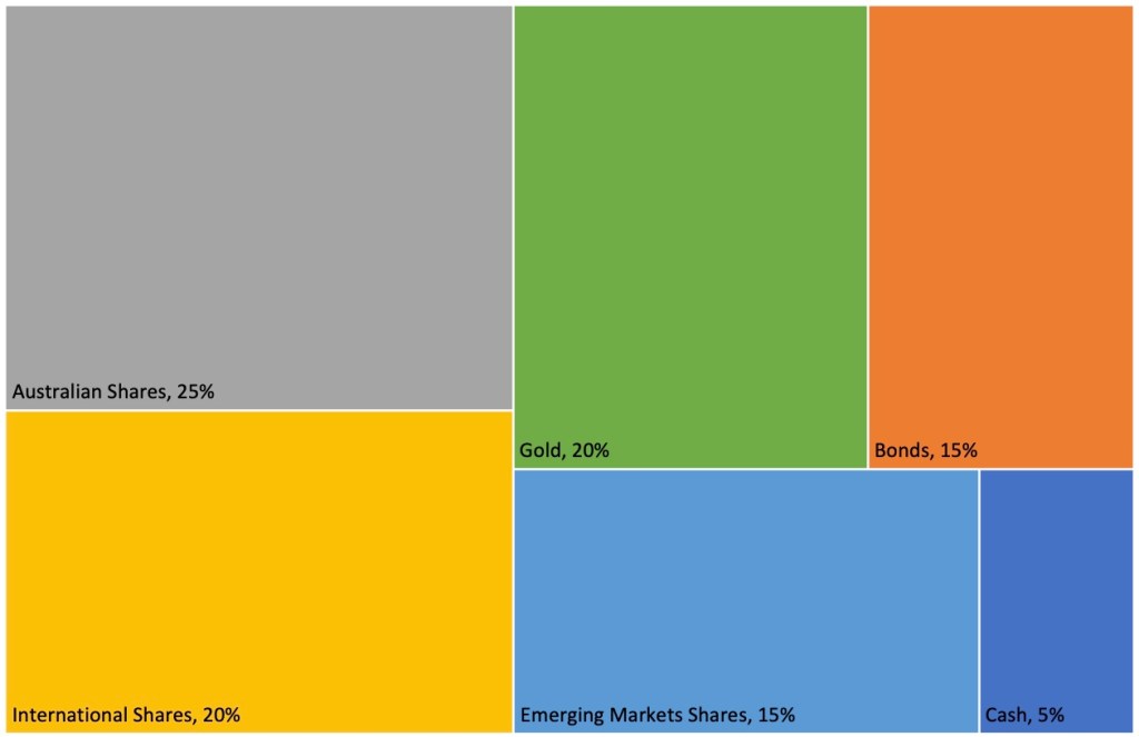 Robo advisers recommend a portfolio of assets for your savings. These are made up of separate asset class components which are often ETFs. A robo adviser’s suggested portfolio might be made up of a set of ETFs such as the example below (this one has a lot of share market exposure and some gold):