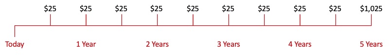 One of the key features of government bonds is the coupon. The coupon refers to the regular interest payment that the bondholder receives over the life of the bond. These interest payments amounts are typically fixed and paid semi-annually. For example, a $1,000 bond with a 5% coupon would provide the bondholder with $50 in interest income every year: $25 every six months. The coupon is an interest payment to compensate the bondholder for lending them money. When the bond matures, the government repays the bondholder the face value of the bond. In our example, the bondholder would receive the initial investment of $1,000 when the bond reaches maturity. The combination of the price paid at the start, coupon payments and the principal repayment determines the overall return on investment for the bondholder. The diagram below represent the cash payments for a $1,000 face value, five year bond with a 5% annual coupon paid every six months. Note that the principal is repaid with the final principal repayment.