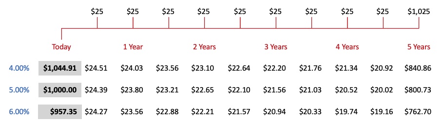 The present value of a government bond is an essential concept to understand, as it represents the value today — or the price — of the bond. Present value is the current worth of the future cash flows generated by the bond, taking into account the time value of money. We have discussed present value in a previous article. In simple terms, present value allows investors to determine how much a bond is worth today, given its future cash flows and prevailing interest rates. As interest rates rise, the present value of a bond decreases because higher interest rates make future cash flows less valuable in today’s terms. Conversely, when interest rates fall, the present value of a bond increases. This is shown in the diagram below which calculates the present value of each of the $25 coupons and our $1,000 principal at various interest rates. The value of the bond today is the sum of all of these present values. At 5% interest our bond is worth $1,000 today. If interest rates rose to 6% our bond value falls to $957.35; if interest rates fell to 4% our bond is worth $1,044.91 today. This is how bond prices change in response to changes in interest rates.