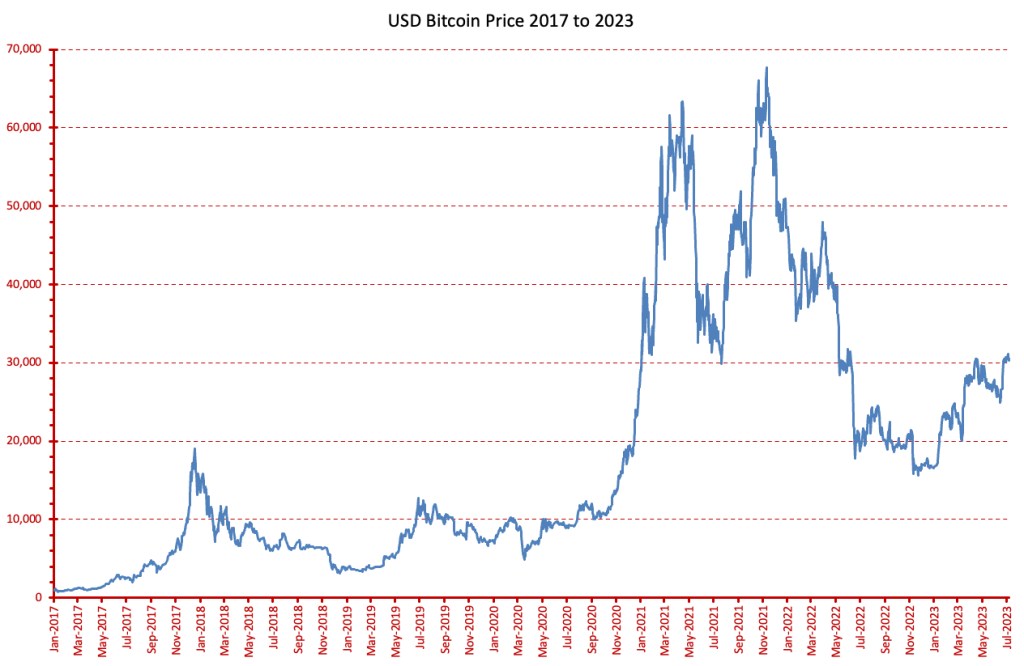 Cryptocurrencies, such as Bitcoin and Ethereum, are notorious for their extreme price volatility. The substantial price fluctuations can create opportunities for gains, but they also expose investors to significant risks. This extreme volatility and speculative nature make cryptocurrencies unsuitable for conservative or risk-averse investors. The chart below shows how volatile the USD price of bitcoin has been since 2017.